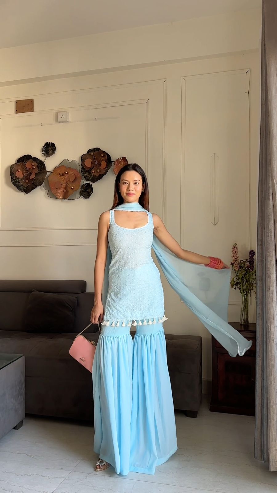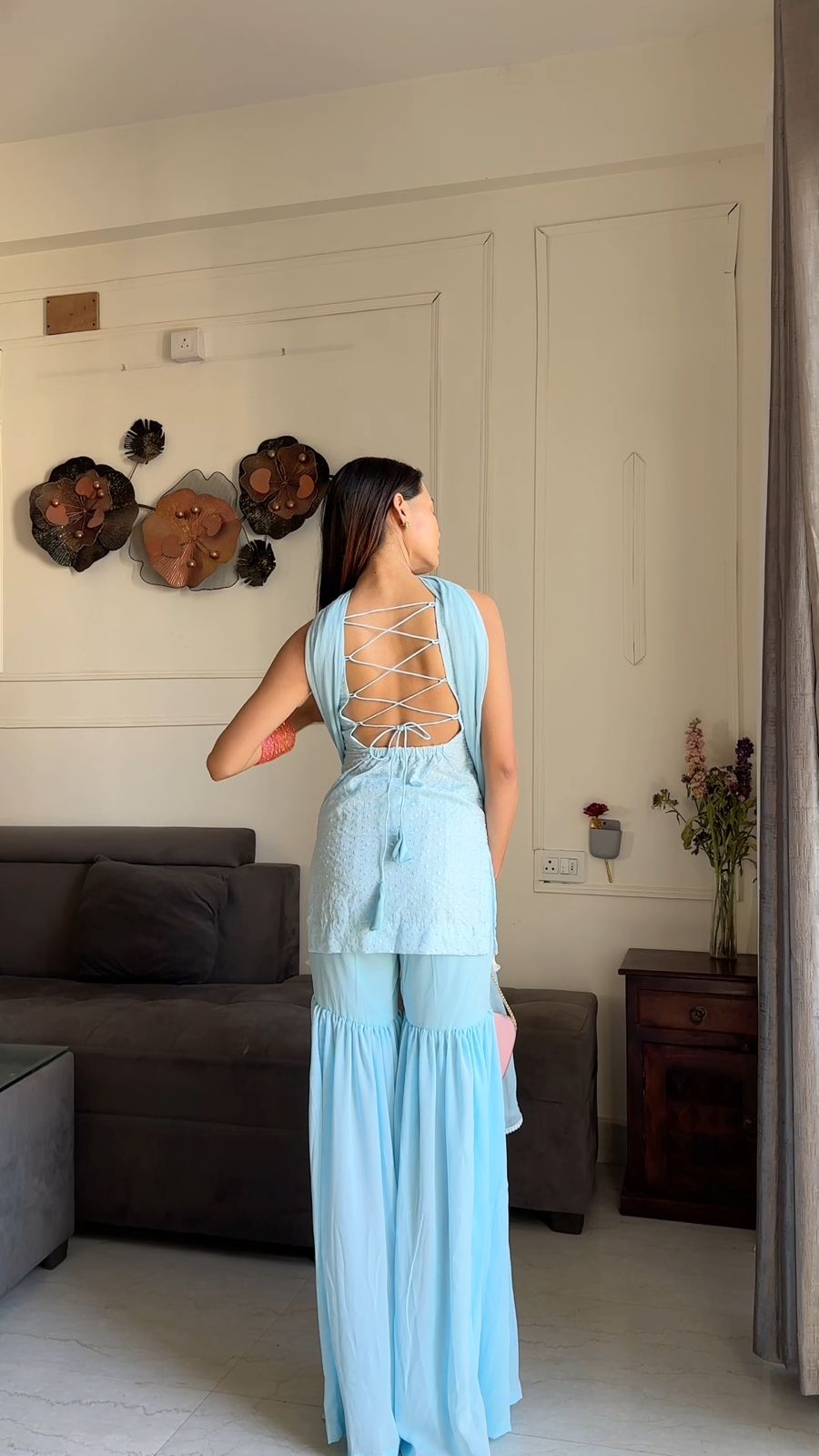 Elevate your ethnic wardrobe with the Naira Sharara Set by Rasiya, a stunning powder blue ensemble crafted for the modern woman who values both elegance and a daring edge. This premium set features a sleeveless short kurti adorned with delicate tonal embroidery and playful tassel detailing along the hem. The standout feature is the intricate lace-up back design, offering a contemporary twist to the classic silhouette.